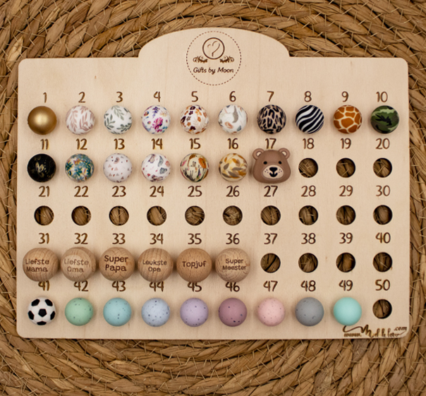 - 2 kleuren letters, 91 kleuren kralen, 16 printkralen, 6 houten kralen, 1 beertje en 3 verschillende kleuren bloemen